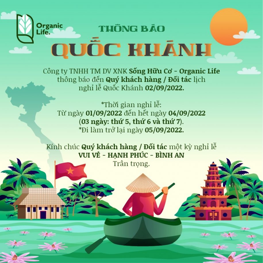 Để thuận lợi hơn trong kế hoạch làm việc giữa Sống Hữu Cơ và Qúy đối tác/ Qúy khách hàng trong những ngày Lễ. Sống Hữu Cơ xin trân trọng thông báo đến Qúy Khách Hàng/ Qúy Đối Tác lịch nghỉ Lễ Quốc Khánh 02/09 như sau:
